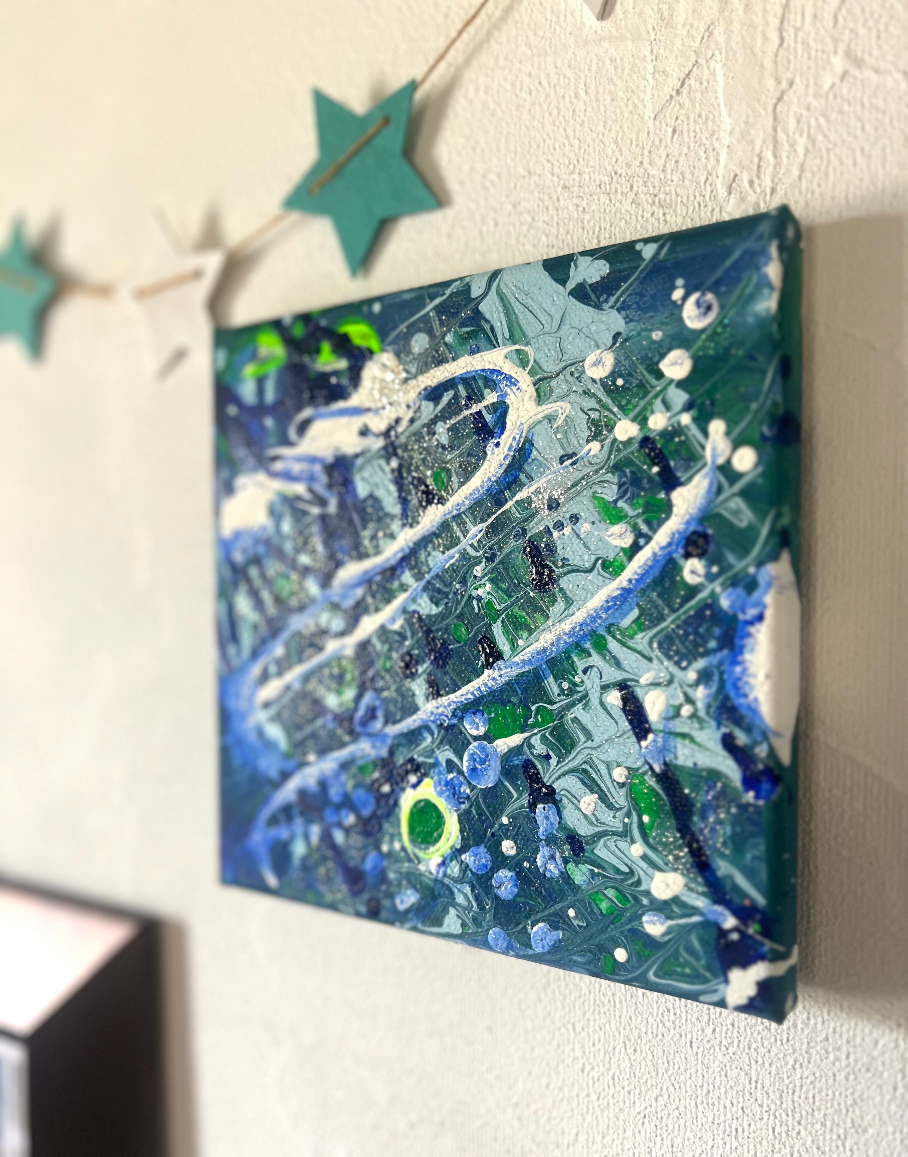 この作品が、あなたのアートセンスを引き立て、感情や思いを表現する素敵なキャンバスとなることでしょう。緑と青の美しいリズムを通じて、心の余裕を感じる瞬間を楽しんでください!